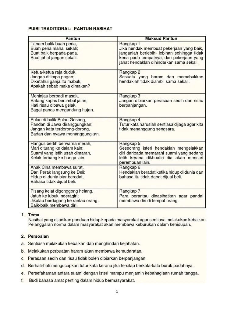 Teknik 01 pantun dua kerat (nasihat) puisi tradisional fokus proses bukan jawapan (faham itu penting) penyelenggara: Tidak buruk/kelihatan cantik/belum pernah dipakai. Isi pantun kaya dengan khazanah ilmu dan berperanan sebagai alat untuk menyampaikan nasihat, pesanan, teguran, kiasan, sindiran dan melahirkan perasaan hiba. Aktiviti lumba haram semakin leluasa. Jul 10, 2021 · komsas (antologi) bahasa melayu (bm) tingkatan 1, 2, 3.